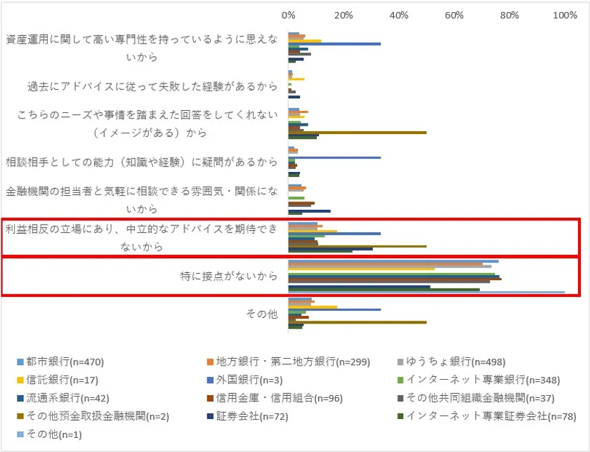 また、資産運用に関する金融機関への相談意向では、約70%の回答者は口座開設先金融機関へ相談する意向はない(相談したいと思う金融機関なし)という結果となった(図2)。その理由として最も高い割合で挙げられているのは、そもそも金融機関との「接点がないから」というものである(図3)。このことからも、口座開設先であったとしても、金融機関との関わりを自覚している消費者は少数であることがわかる。また、「利益相反の立場にあり、中立的なアドバイスを期待できないから」との回答も一定数あることから、一定数の消費者は金融機関を資産形成パートナーとして信頼できていないこともうかがえる。
