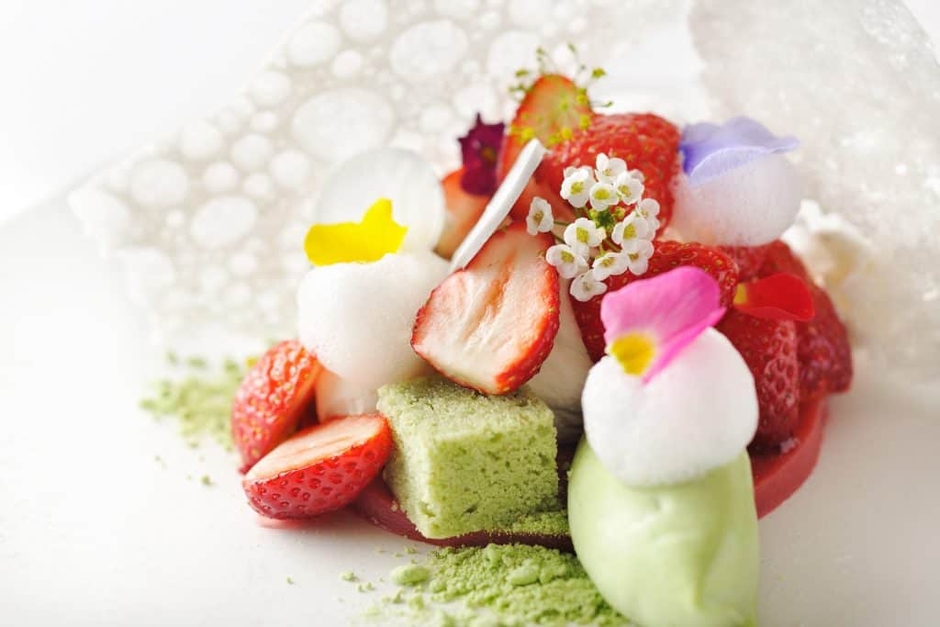 甘味と酸味のバランスが良い春のイチゴに、爽やかなミントのジェラートを合わせました。コクがあるピスタチオのビスキュイやミルクのチップ、バラの泡を添え、軽やかに仕上げました。
