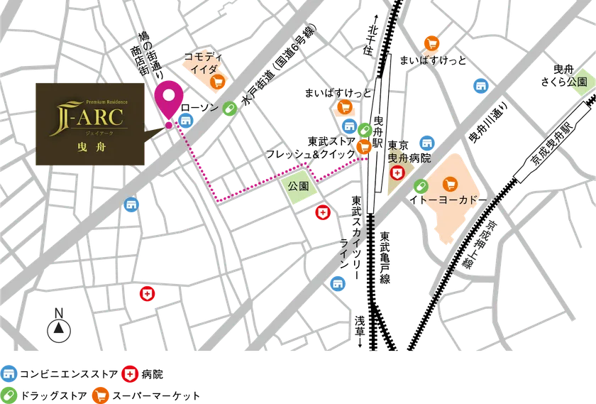 「J-ARC曳舟」は、東武スカイツリーライン「曳舟」駅より徒歩5分で、大手町、永田町、渋谷といった都心の主要駅へ乗り換えなしでアクセス可能な交通利便性の良い好立地にございます。
