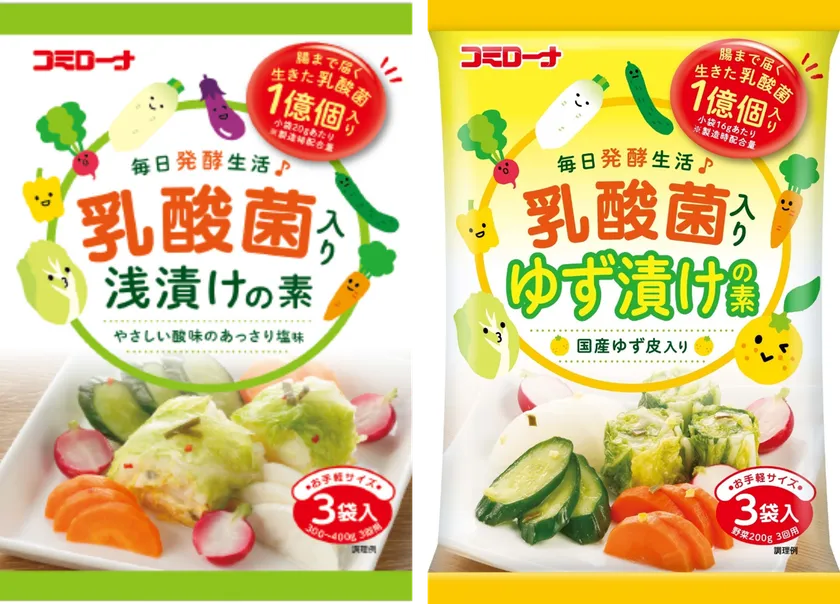 小袋1袋当り、約1億個の乳酸菌を配合してあるため、生きた乳酸菌が腸まで届きます。当社、乳酸菌入りシリーズ(乳酸菌入り浅漬けの素・乳酸菌入りゆず漬けの素)に続く第3弾として発売しました。