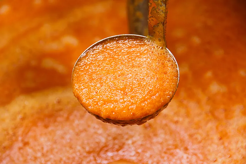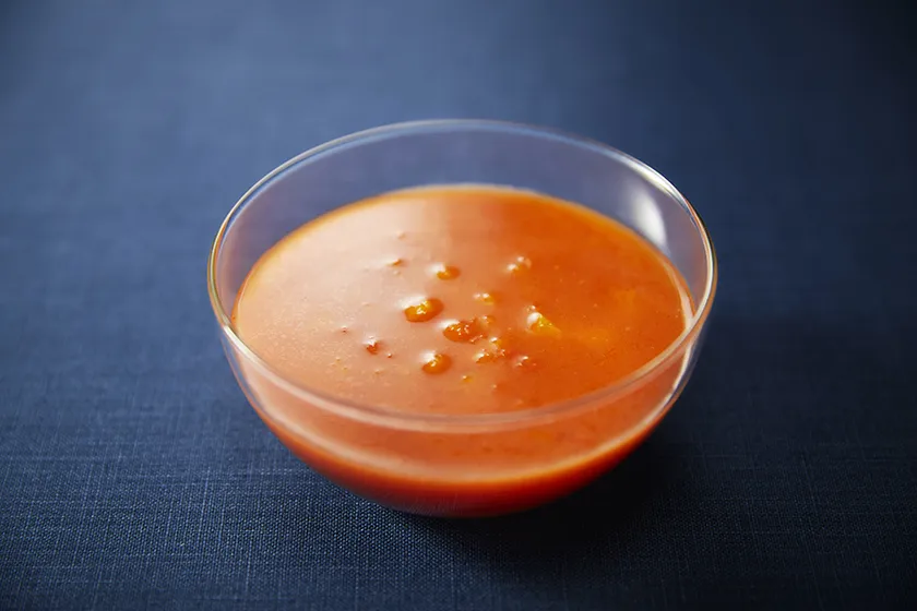 味わいの異なる「赤」、「黄」、「オレンジ」の3種類のパプリカを、自社工場でピューレーに加工し使用しています。オレンジ色のパプリカは甘みが強く、黄色のパプリカはさっぱりとした味わいで、赤のパプリカはその2つの中間の味わいです。パプリカを組み合わせて、ガスパチョにした時にバランスがよい味わいになるようにしています。