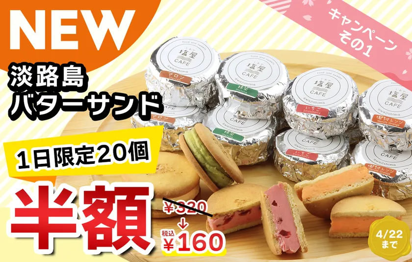「塩屋CAFE」を運営する株式会社淡路島第一次産業振興公社は、オリジナル新商品「淡路島バターサンド」の発売を記念して、3月23日から4月22日までの期間、1日20個限定の半額キャンペーンを実施します。あわせて同期間に、好評の「淡路牛ステーキバーガー」を最大500円OFFのSNS投稿キャンペーンを実施します。