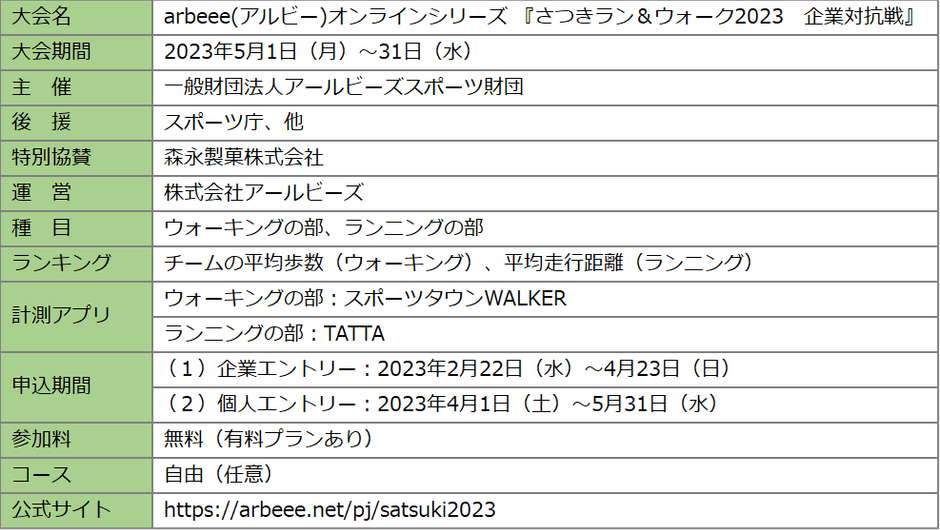 arbeeeオンラインシリーズ 『さつきラン&ウォーク2023 企業対抗戦』(主催:一般財団法人アールビーズスポーツ財団、運営:株式会社アールビーズ)を 2023年5月1日(月)より開催いたします。