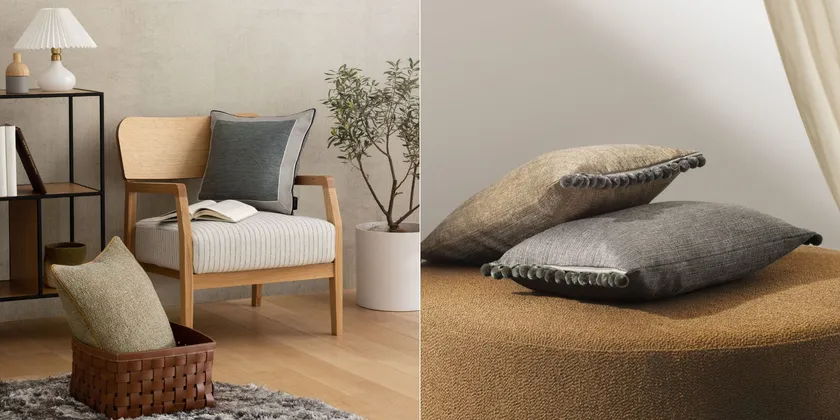 クッション一つひとつの素材感やトリムのチョイスなど、細部までこだわってつくりました。ぽこぽことした凹凸が可愛らしいものや、太さの異なる糸で構成されたざっくりとした織り感のものなど、ファブリックは唯一無二の素材感を採用。その素材感の個性を最大限に活かすためのトリムにもこだわり、質の良さは勿論、絶妙な色使いやデザインに定評のあるヨーロッパのブランドからチョイスしました。