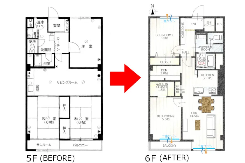 同じ間取りからリノベーションを行った住戸と工事を行っていない住戸を6階と5階の上下で見学することができます。このように全くリノベーションをしていない部屋と、新築のようにリノベーションしている部屋の2部屋を同時にご覧いただける機会は中古住宅ではほとんどありません。設立22周年を迎えた記念事業として行います。