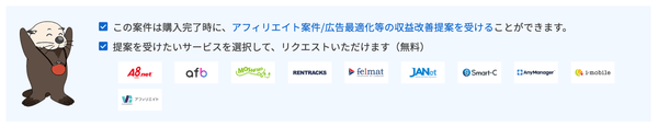 本機能は、ラッコM&Aで購入したWEBサイトに対して、当該WEBサイトにマッチしたアフィリエイト広告案件の提案をASPから受けられる、または収益改善の提案を提携パートナーから受けられる買主様用の機能です。アフィリエイトASP・WEBマーケティングサービスの提供会社様にご参画いただいています。