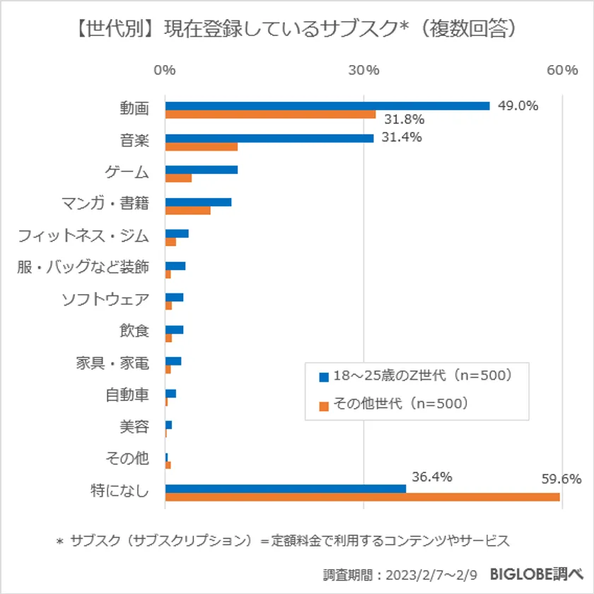 全国の18歳から25歳までのZ世代の男女500人とその他世代の男女500人に、「現在登録しているサブスク(の種類)」を複数回答で質問したところ、Z世代では「動画」と答えた人の割合は49%となり、約半数が登録しているという結果となった。