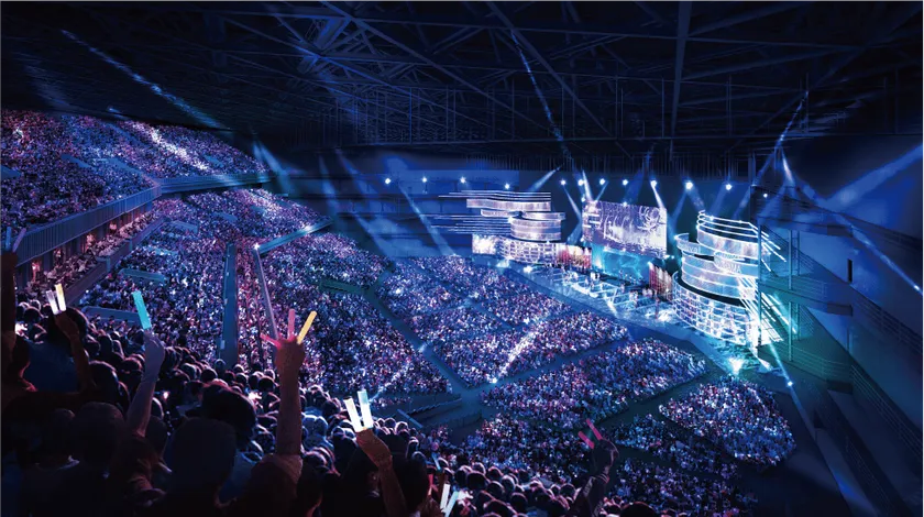 2万席を誇る客席は、全席に長時間快適に過ごせるファブリックシートを導入します。ステージ前方のアリーナに加え、三層構造となるスタンドの全席がステージ正面を向いた扇型の形状で、アーティストの表現が真正面から真っ直ぐに届き、迫力と一体感を生み出します。