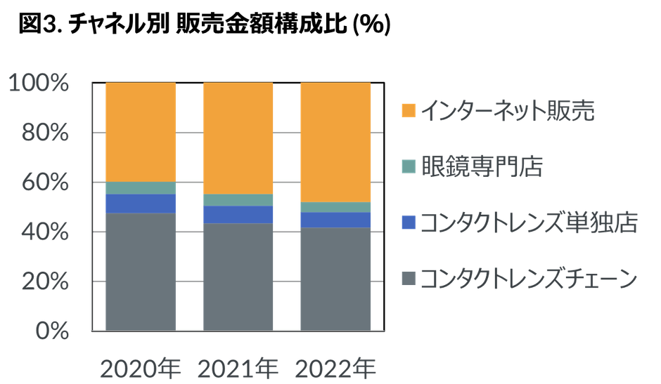 チャネル別の構成比を見ると、インターネットが前年の45%から48%と3%ポイント上昇した。一方、店頭販売はいずれのチャネルも構成比を下げている。過去からの推移をみると、2020年の構成比はコンタクトレンズチェーンが一位で、2021年に順位が変わってインターネットが一位となり、2022年はさらにインターネットが構成比を伸ばした (図3) 。コンタクトレンズチェーン以外の店頭チャネルである眼鏡専門店やコンタクトレンズ単独店でも販売金額の減少が続いている。店頭チャネルではケア用品が必要ない1日使い捨てレンズの金額構成比が伸びていることもあり、ケア用品販売への重視度が変化した可能性がある。直近3年間で増加となったのはインターネットのみで、さらに存在感を強めている。
