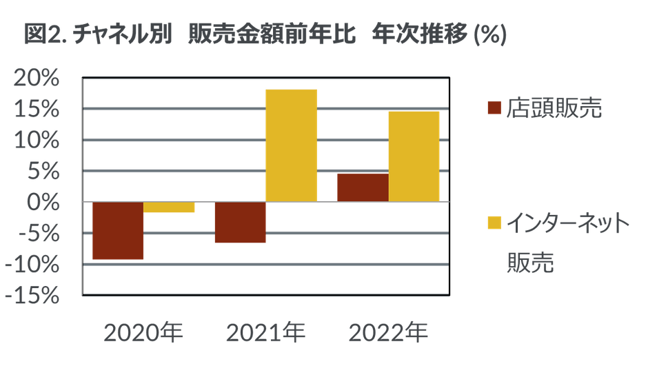 販売チャネル別で見ると、インターネットは金額前年比15%増となった(図2)。2年連続の二桁成長で、市場の成長を下支えしている。一方、店頭も前年比5%増とプラス成長となった。店頭販売は新型コロナウィルス感染症の拡大以降減少が続いたが、2022年は外出による需要拡大に加え、実店舗を利用する機会が増加したと思われる。店頭とインターネットともにプラス成長となったことが市場回復の好材料になったと言える。