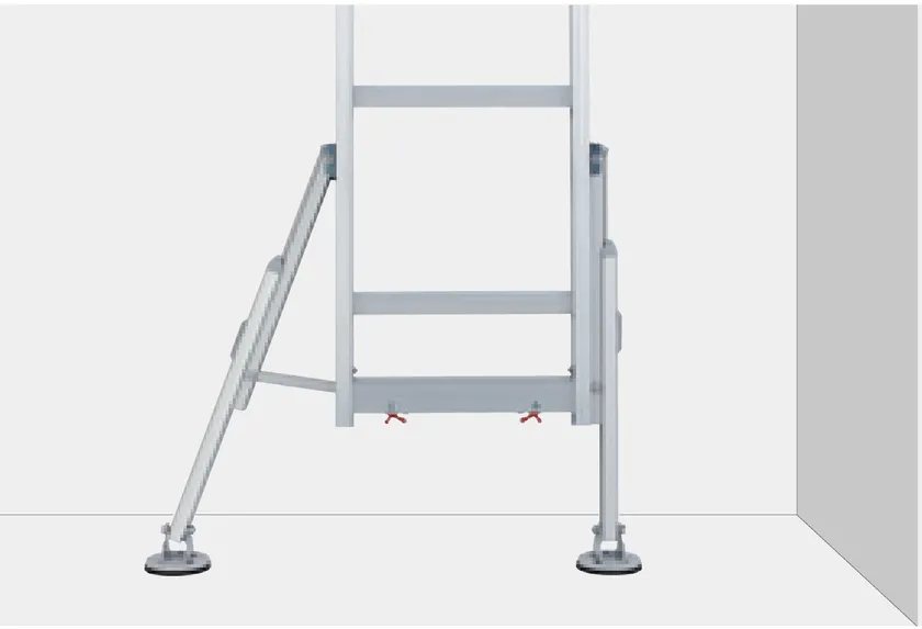 ・さらに片側が壁の場合は、片側だけスタビライザーを開脚し設置ができます。※はしご上で作業はNG