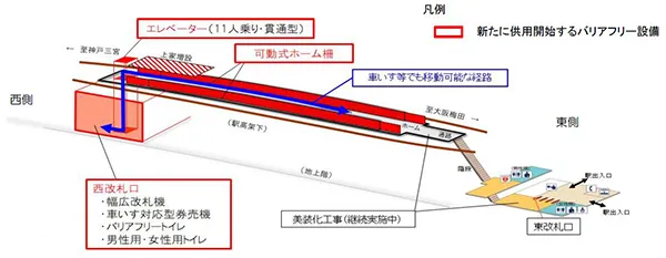 このたび本工事が完了し、3月18日(土)初発から、神戸三宮方に新設した西改札口・エレベーター・トイレおよび可動式ホーム柵の供用を開始しますので、お知らせします。