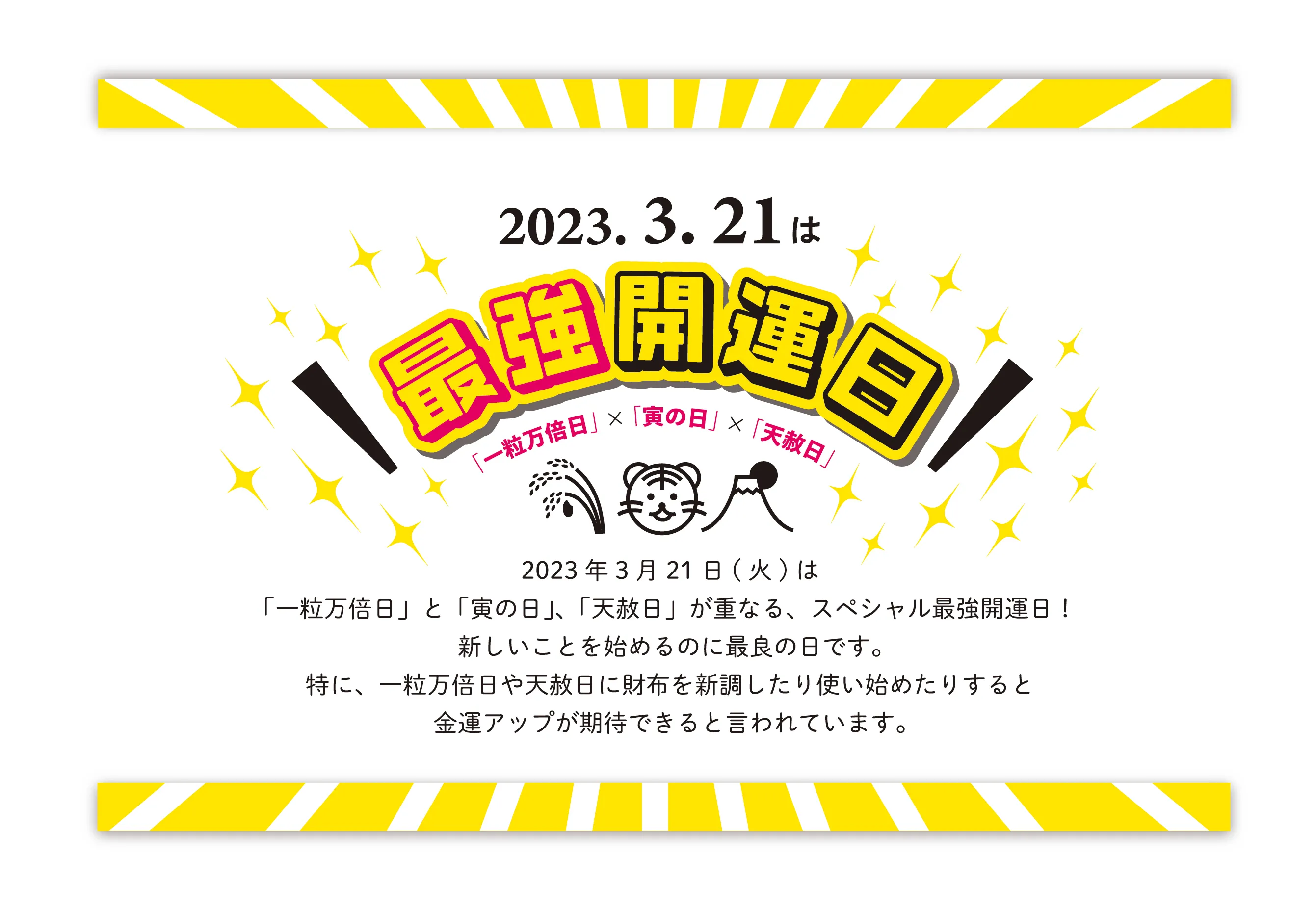 2023年3月21日(火・祝)は「一粒万倍日」「天赦日」「寅の日」が重なる開運日です。金運・財運に恵まれる吉日とされており、この日に合わせて財布を新調する方も多く、昨年の開運日には通常の約7倍の売上となりました。