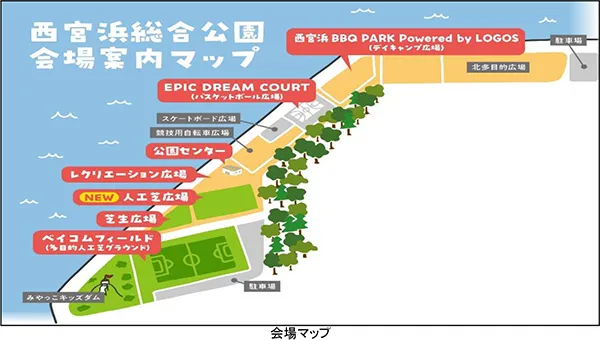 本催しは、「西宮市」および西宮市に本社を構える古野電気株式会社(本社:兵庫県西宮市 社長:古野幸男)協力のもと、西宮浜総合公園内施設のネーミングライツパートナーに選ばれた株式会社ベイ・コミュニケーションズ(本社:大阪府大阪市 社長:竹間郁夫)や株式会社EPIC DREAM(本社:兵庫県神戸市 社長:岸田大佑)と連携を図るほか、西宮市を中心に活動されている企業・学校などの団体とともに、様々なコンテンツを企画します。また、公園全面開園を記念したオープニングセレモニーでは、西宮市長 石井登志郎様にご挨拶いただき、オープンを祝します。
