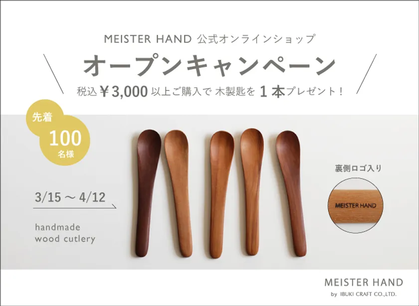 おうちの中でも、アウトドアでもとっても使いやすいマイスターハンドオリジナルの木製の匙を3,000円以上(税込)ご購入の方にプレゼントいたします。