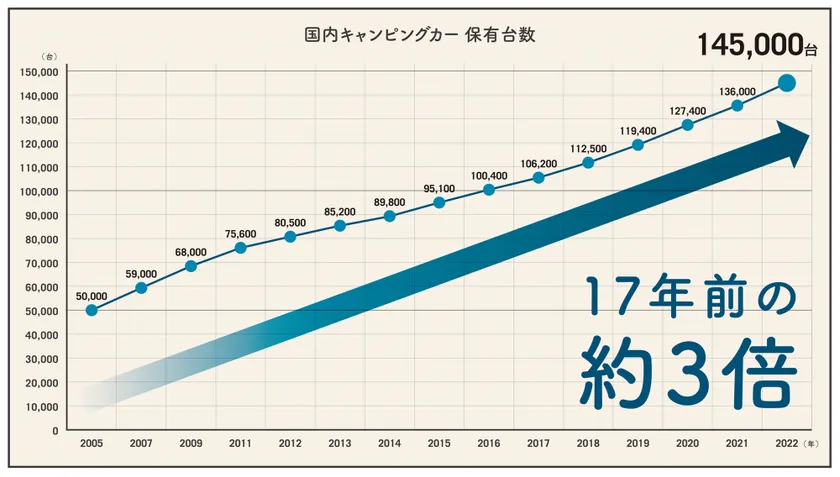 国内販売台数と廃車台数などを調査し、算出した国内キャンピングカーの保有台数は、調査当初から増え続けており、2022年は前年より9,000台増えて145,000台となりました。様々な車両タイプの流通や、昨今の車中泊をはじめとするアウトドアブームを受け、新しいライフスタイルのなかにキャンピングカーという文化が浸透してきたのではないでしょうか。