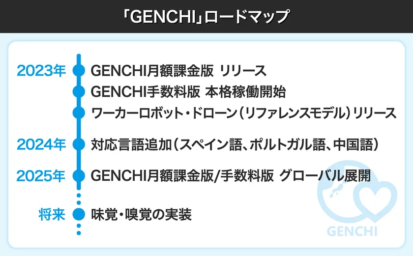 当社は、将来的には、人間拡張の技術を応用して五感すべての共有を実現し、「GENCHI」による移動のリアリティをさらに向上させることで、場所にしばられない世界の実現を目指します。