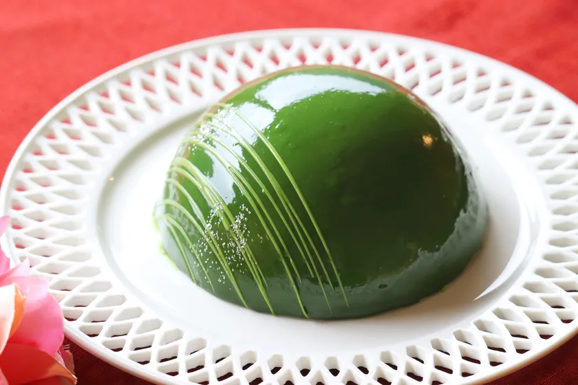 インパクトたっぷりの色鮮やかな緑色の抹茶グラサージュ(抹茶コーティング)は、着色料不使用。抹茶の風味と色を損なわないよう、できるだけ熱を加えない特別レシピです。