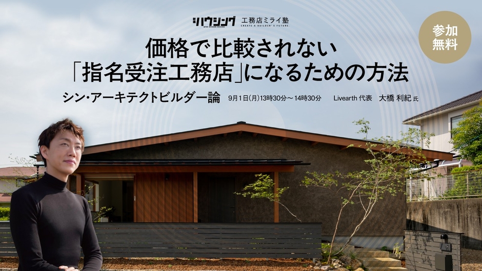 新建ハウジングでは、工務店経営者・設計者向けに、Livearth×OhashiArchitects 代表・大橋利紀氏による無料オンラインセミナーを開催いたします。