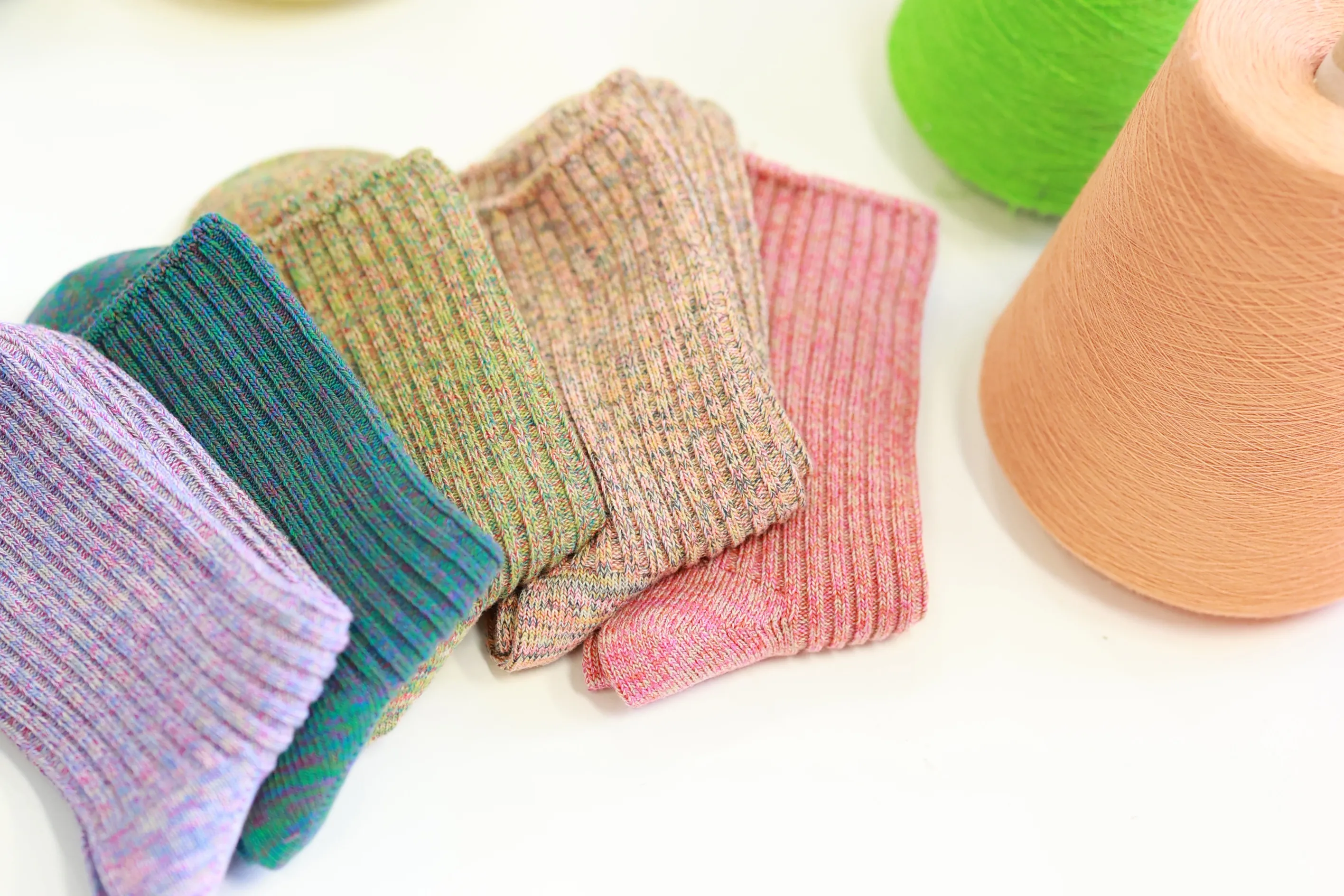 残糸にはありとあらゆる種類の糸があり、素材・色・量すべてがまちまちです。残った糸を組み合わせて靴下を製品化するには色組み、デザイン性や残糸の量(どんな糸がどれだけ残っているか)など様々な課題があります。そういった課題をクリアして製品化されたのが、アップサイクルされたサスティナブルなアイテム(SDGs SOCKS(仮))です。
