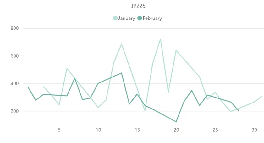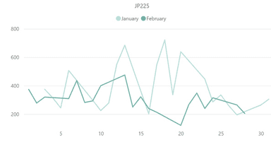 上記は、日経平均株価(JP225)の1月と2月のボラティリティ推移を比較したグラフです。2月の日経平均株価は、本調査対象のCFD銘柄でも特にボラティリティ低下が確認された銘柄でした。1日当たりの平均ボラティリティでは、1月が約381pipsに対して、2月は約297pipsと約23%低下しています。最大ボラティリティに関しても、1月の最大ボラティリティ685pipsに対して2月は475pipsと、大幅な低下を見せました。