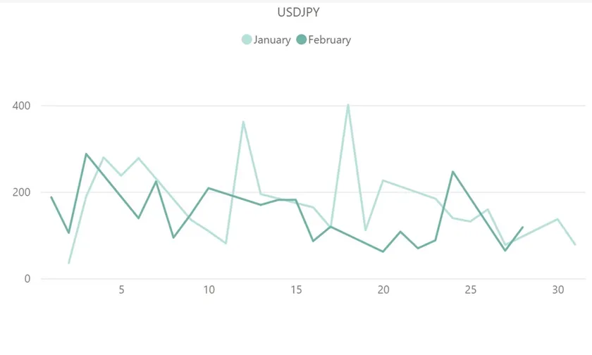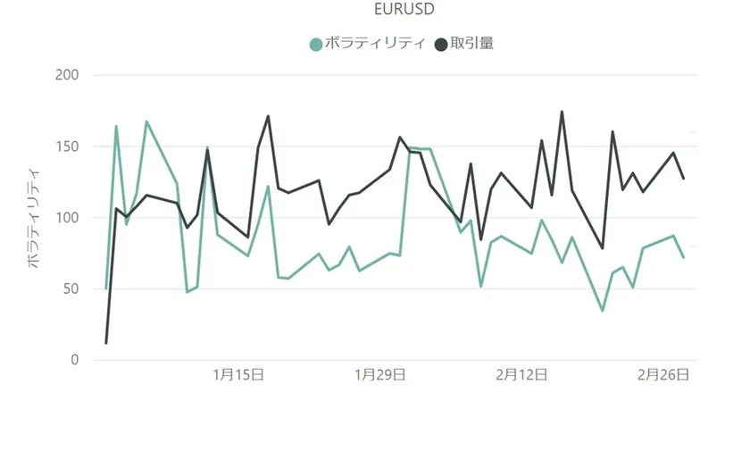 上記は1月・2月を対象にしたユーロドル(EUR/USD)の取引量とボラティリティの推移を示したグラフです。2月で最もユーロドルの取引量が多かったのは14日で、同日は米国の雇用変化および国内総生産の発表がありました。ボラティリティが最大を記録したのは1日だったため、ピークを付けた日付に大きな差があることを確認できます。ただし、全体を通してみると極端な取引量の増加とは言えず、ボラティリティも1日以降100pips未満に収まるなど、2月のユーロドルは動きの鈍い1か月間であったといえます。