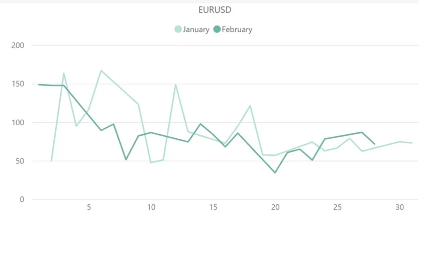 上記はユーロドル(EUR/USD)の1月と2月のボラティリティ推移を比較したグラフです。2月のユーロドルの平均ボラティリティは85pipsで、1月の平均ボラティリティ88pipsと比較してほとんど変化がありませんでした。2月に最もボラティリティが高かったのは1日の148.7pipsです。同日の米国の主要経済指標、翌日にはECBによる金利決定など、立て続けに重要指標の発表が控えていたことが、ボラティリティの上昇要因になったと考えられます。