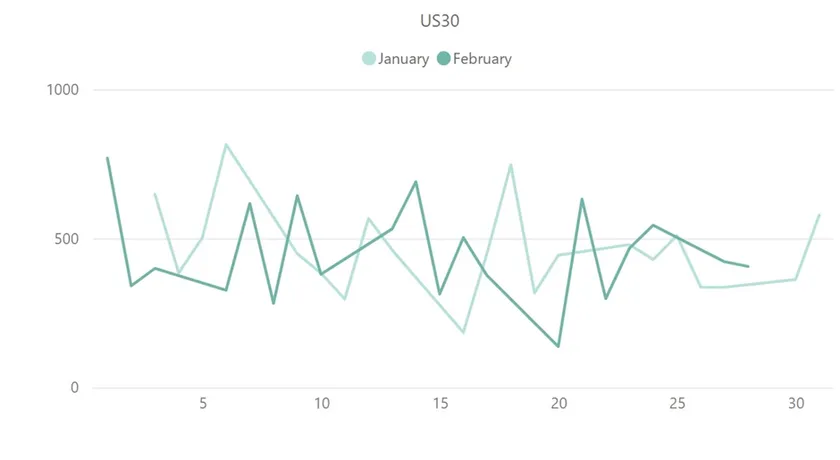 ダウ平均株価(US30)の1月と2月のボラティリティ推移を比較した上記グラフから、2月のダウ平均株価は他のCFD銘柄と比べて、ボラティリティの低下が少ない銘柄だったことが確認できました。1日当たりの平均ボラティリティでは、1月が約460pipsに対して2月は約453pipsとほとんど変動がありません。1日当たりの最大ボラティリティを記録したのは、翌日に米国小売売上高の発表を控えていた14日の689.9pipsです。注目度の高い材料だったため、リスク回避のためにポジション解消の動きがあり、ボラティリティが高まったと考えられます。