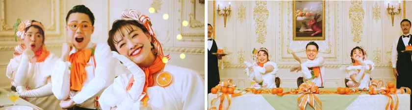 中世にタイムスリップしたかのような巨大シャンデリアが輝く場所で、ジュレ♪ジュレ♪♪と連呼する音楽に奇妙なヴォーグダンスを踊り始めるダンサーたちの前にはグラスに入った「飲むジュレみかん」。
