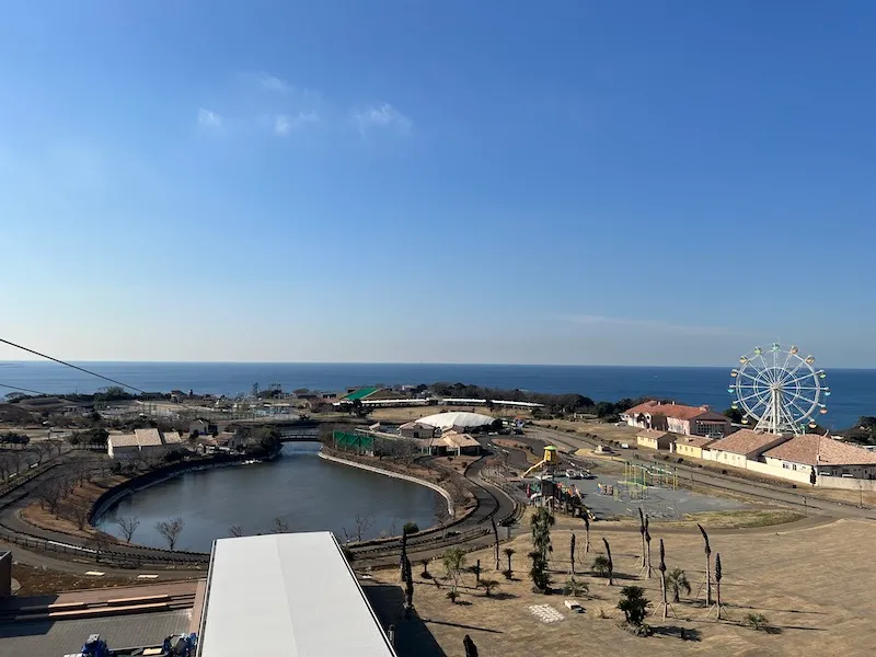 入口ゲートをくぐった芝生広場がトレインの出発駅。じゃぶじゃぶ池を通過すると、目の前には相模湾の絶景が広がります。園内を定期的に周遊しています。
