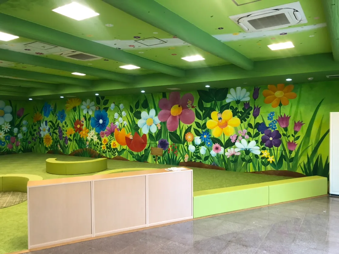 童話の世界に入り込んだようなお花いっぱいのキッズルームが新登場。子どもたちの豊かな感性と想像が花開く空間を目指し、さまざまなアート・絵本・人と出会い繋がる地域の子育て拠点です。
