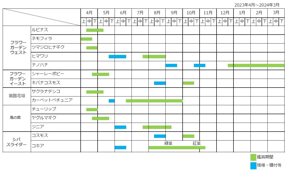 | フラワーガーデン イースト / ウエスト | シーズン毎に表情の変わる花畑が2倍の広さに。 春はネモフィラやシャーレ―ポピー、夏はヒマワリ、秋はキバナコスモス、冬はナノハナを中心に色とりどりの花に囲まれたとっておきの時間・空間を楽しめる場所になります。 花畑には、立体的でアーティスティックな花や緑が楽しめるフォトスポットもあります。 |