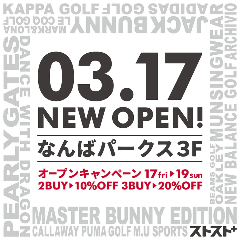 中古ゴルフウェアショップ「ストスト+なんばパークス店」3月17日から3日間のオープンキャンペーンを開催