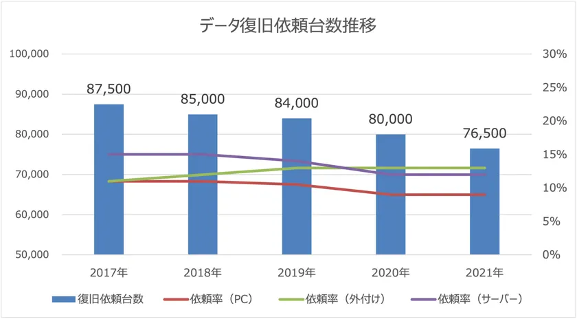 2021年のデータ復旧市場規模について統計データを発表 パソコン(PC)のデータ消失率に変化 新型コロナウイルスおよびランサムウェア被害の影響 2021年(1~12月)データ復旧依頼数は76,500台と推定