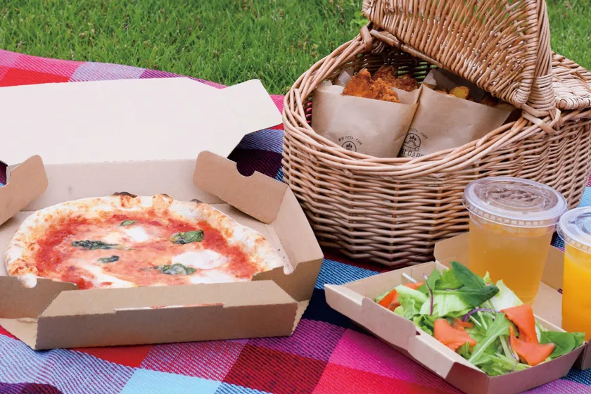 専用カウンターから出来たてをTakeoutし、パーク内でお楽しみいただけます。Takeoutのおすすめは、当店自慢の薪釜ピッツァとドリンク、サラダ、ナゲポテが全部セットになったお得な「PICNIC SET(ピクニックセット)」です。公園内でピクニック気分でお楽しみください。