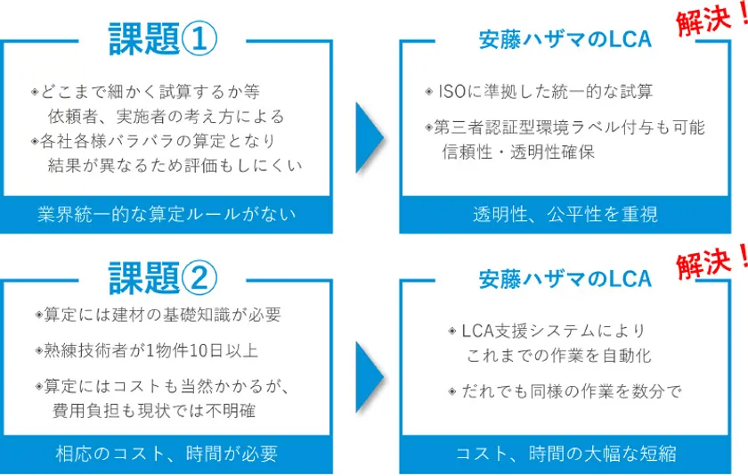 安藤ハザマ(本社:東京都港区、社長:福富 正人)は、脱炭素社会の実現を見据え、建設事業等の事業活動に関連する温室効果ガスの削減に向けてさまざまな取り組みを推進しています。その一つとして、温室効果ガスなどの環境影響物質を建築工事の見積書から自動計算する仕組み(以下、LCA(ライフサイクルアセスメント)(注1)支援システム(注2))を開発しました。本システムにより、「業界統一の算定ルールがない」「相応のコストと時間が必要」の2つの課題を解決し、建物のライフサイクルを通じた公的なLCA算定数値「見える化」情報をお客様に早期に提供します(図1)。