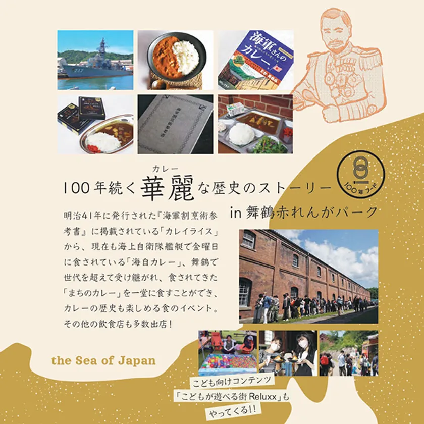 通常のカレーイベントとは異なり 今回「カレーの歴史が楽しめる」をコンセプトにしています。明治41年に発行された『海軍割烹術参考書』に掲載されている海軍カレイライスから、現在も海上自衛隊で金曜日に食されている海自カレー、そして舞鶴市で生まれ育った「まちのカレー」を一堂に食すことができるイベントになっています。更にその他の飲食店も多数出店を予定しており、約30店舗が集結します。