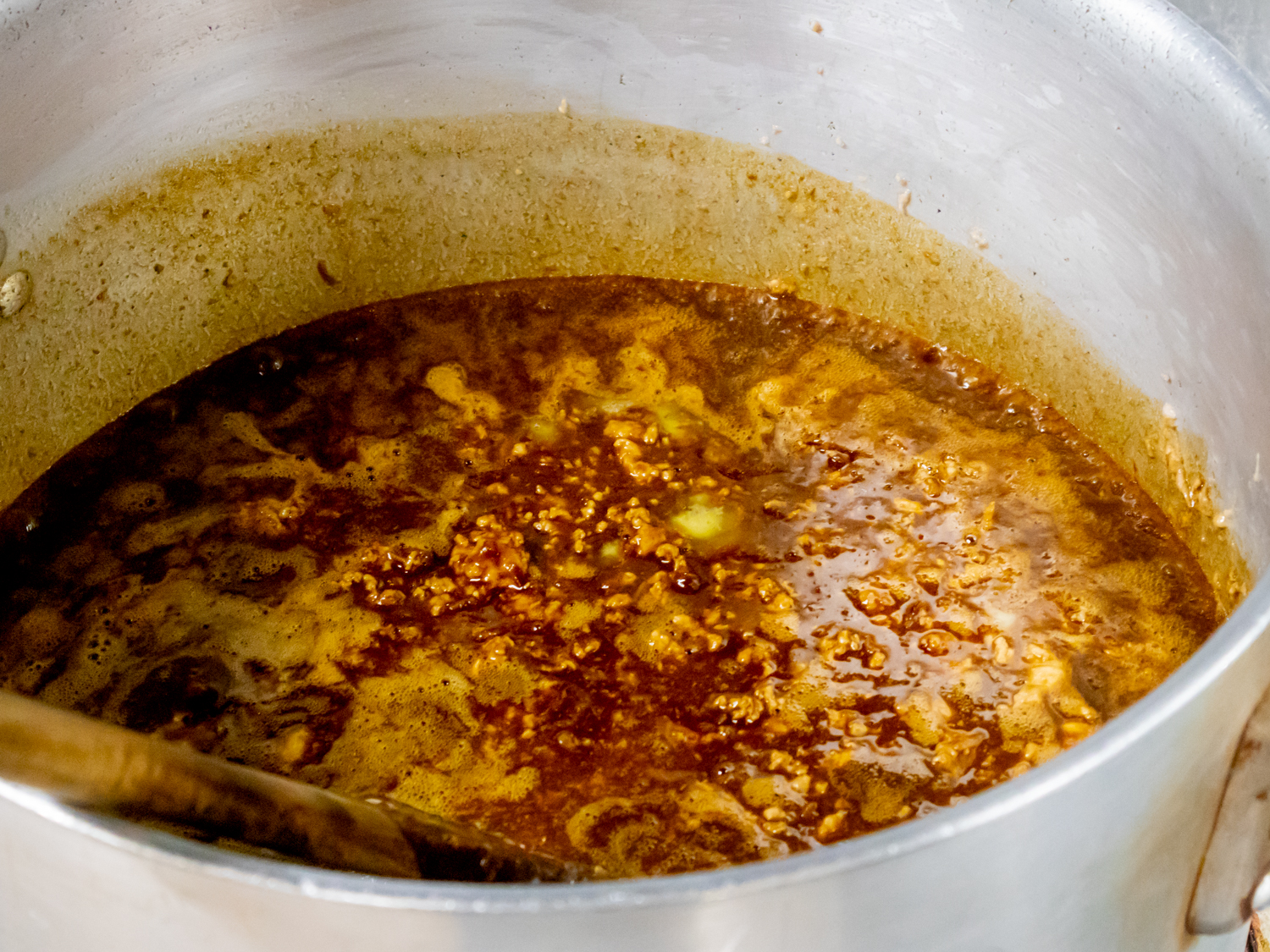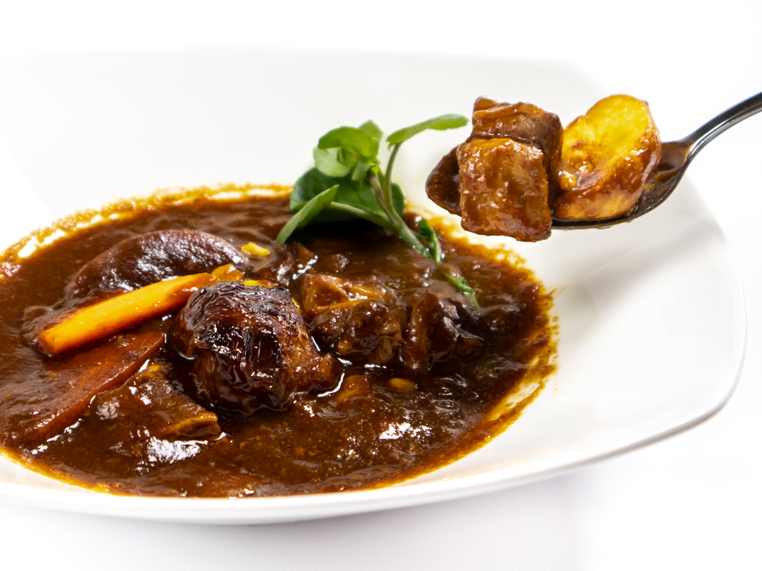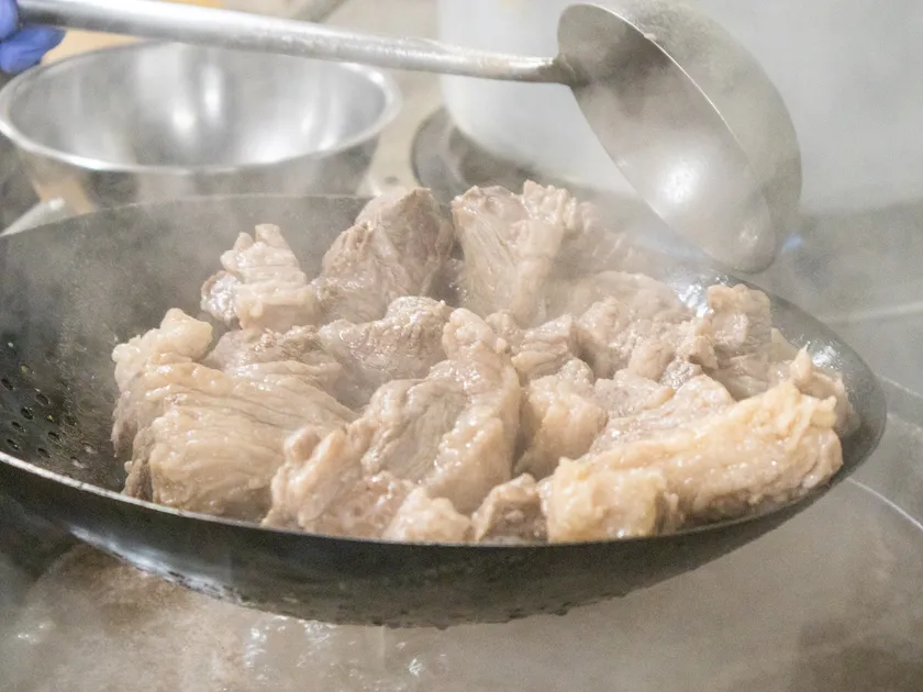 北海道は日本最大の牛肉の産地であり、高温多湿を好まない牛にとって最も適した生育環境です。一度下茹でをしてから時間をかけて柔らかくなるまで低温でじっくりと煮込むことで牛肉の旨みを存分に味わえる調理を施しました。