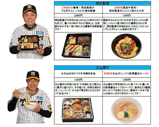 今シーズンは、就任初年度となる岡田監督の「豪華!岡田監督のうなぎちらし×カルビ焼肉御膳」やワールド・ベースボール・クラシック日本代表に選出された中野選手の「中野の生姜焼き×チャーハン弁当」、湯浅選手の「湯浅の厚切りロース味噌カツ丼~低温熟成ポーク使用~」等、11名の新たなグルメが登場します!計22名、35種類以上の充実のラインナップを是非お楽しみください。