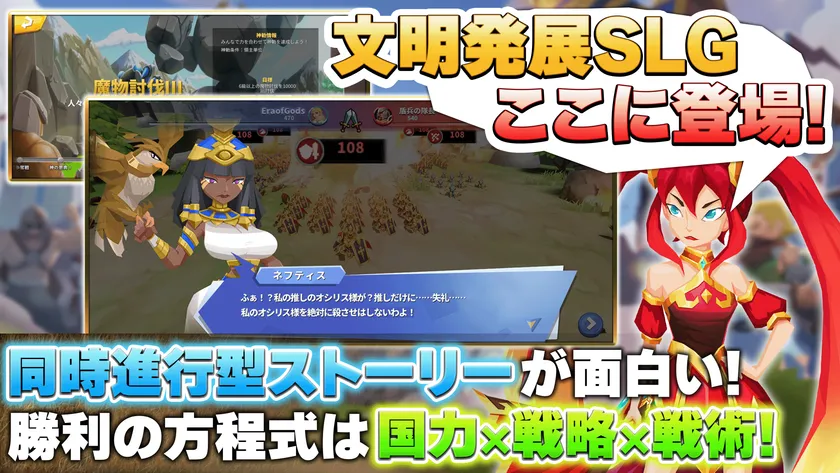 「Era of Gods Online」は、3つの古代文明から1つを選び、プレイヤー達で国家を経営したり、どう生きるか話し合うMMOSLG型のオンラインゲームです。神々と文明をテーマに、オープンワールドで資源採取や交易、戦闘を楽しく遊ぶことができます。