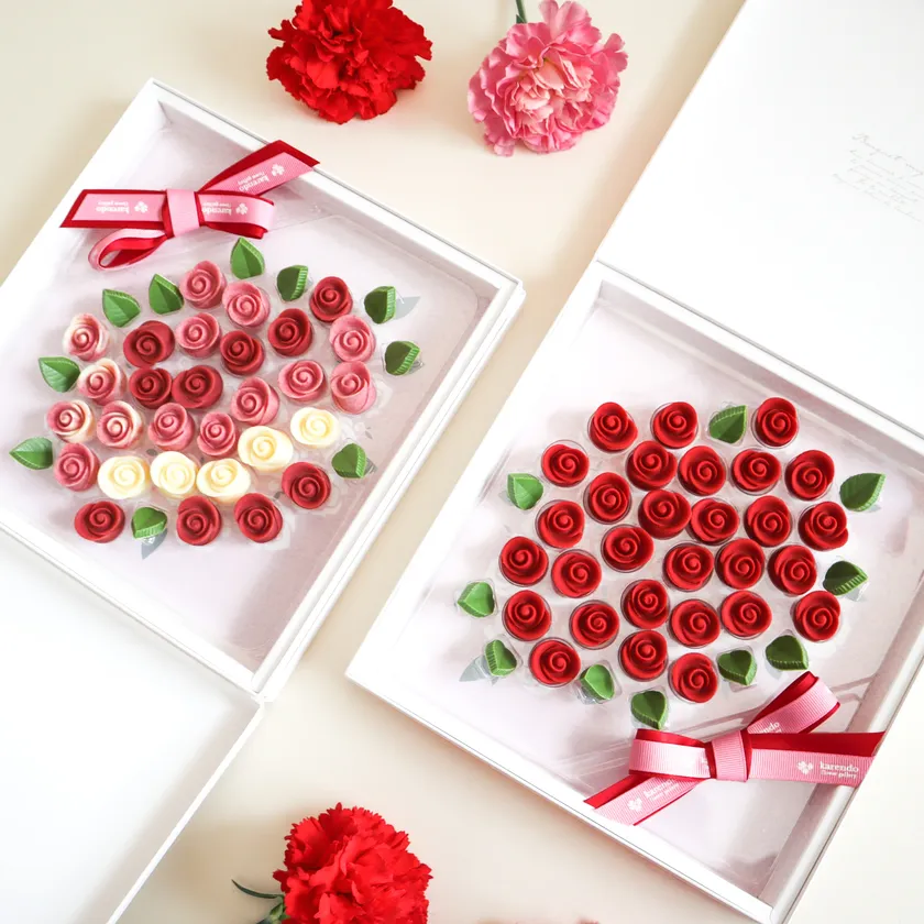 小さな可愛いバラのチョコレートを花束風に見立てた、目にも鮮やかなチョコレート。まるでお花が次々に咲いているような可愛らしいデザインは、母の日のギフトに最適です。箱を開けた瞬間の笑顔が浮かぶような、母の日限定のスペシャルなチョコレートです。
