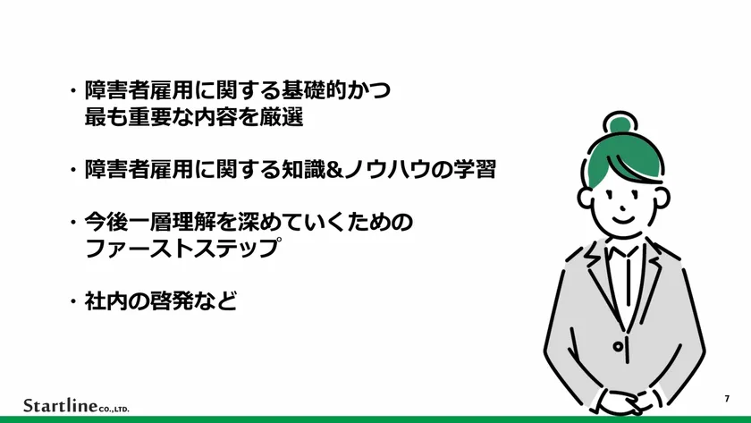 多様な人材雇用に対応する企業において、障害者を受け入れる部署では特に、障害者雇用の意義や法令に関する基礎的な知識が必要となります。今回提供を開始する「障害者雇用初級研修」シリーズは、「障害者雇用の理念」、「障害者雇用関連法令」、「障害に関する基礎知識」の3コースで構成されています。障害者雇用の全体像や障害の捉え方をはじめ、関連する法律、各障害の特性・サポートのポイントを学習できる内容となっています。障害者雇用の促進、障害のある方との関わりやマネジメントにおける方向性の選択肢拡大にご活用ください。