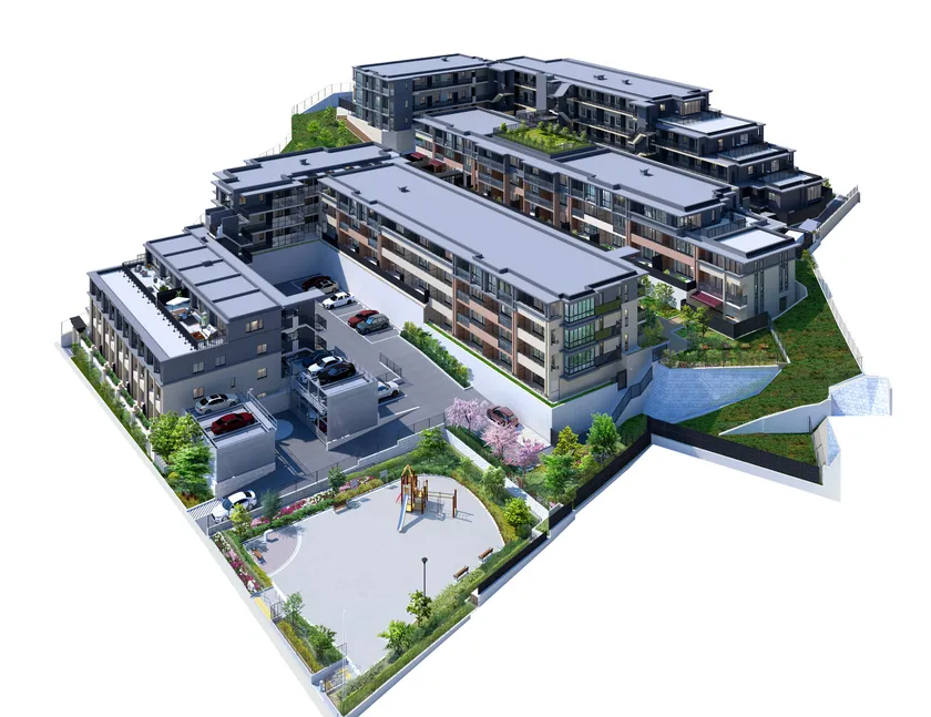 (2) 第一種低層住居専用地域の開発区域面積10,000m2超の広大な敷地に、従前の地形の高低差を活かした個性的な6棟のvillaを配棟。開放感と採光性を高めた全125邸