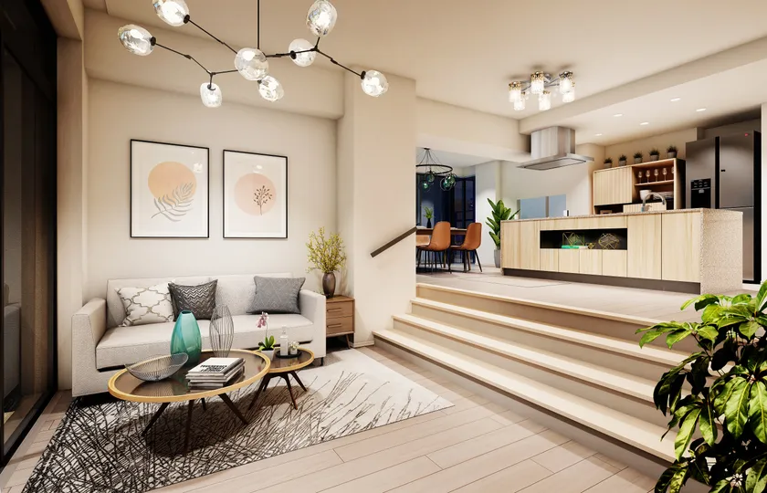 敷地の高低差を活かして、メゾネット、スキレージ(スキップフロア&ストレージ)、グルニエ(ロフト)等、マンションでは実現が難しいとされる専有部の室内の“高さ”に着目した立体的なプランを多く採用しました。