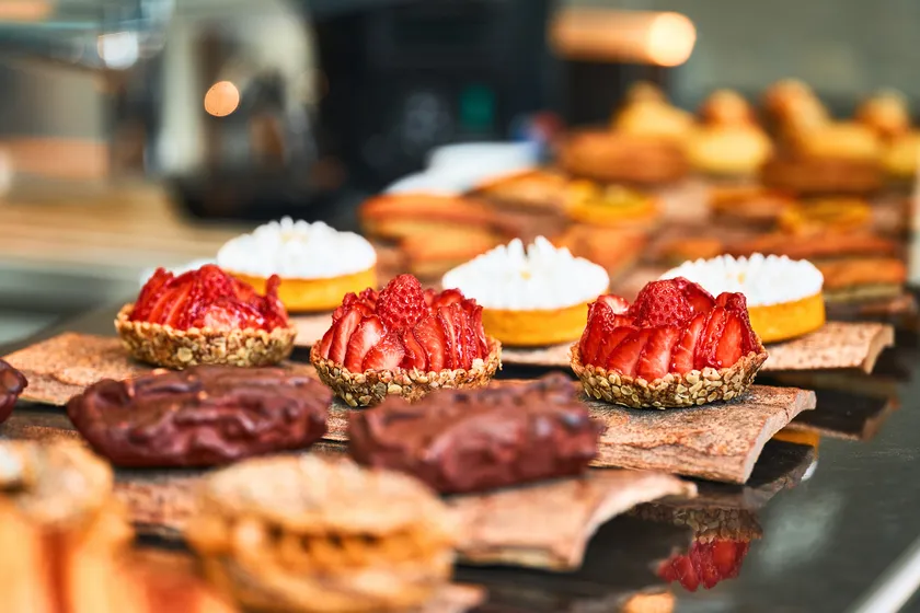 フランスで昔から旅のお供やピクニックの定番として親しまれるさまざまな味わいの“ガトー・ド・ヴォワヤージュ(焼き菓子)”。またMUNI KYOTOの“シグネチャー”として、朝食や散策のおやつにお召し上がりいただける風味あふれるブリオッシュ。ル・ショコラ・アラン・デュカスのクーベルチュールを使用した2種類のオリジナルチョコレートタブレットは、ピスタチオやドライイチジクなど8種類のナッツやドライフルーツをのせ、MUNI KYOTOのロゴをイメージしています。どれもパティシエが一つ一つ丁寧に手作りしたMUNI KYOTOならではの味わいです。