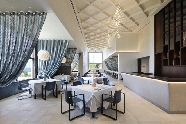 高さ5mの天井が生み出す開放的な空間が広がり、海と白い砂浜を連想させる、青と白を基調とした内装。青い壁の塗料にはわずかにシルバーを混ぜ、海中を泳ぐ小魚や水面の光を表現。白い壁には砂粒ほどの大きさの骨材を混ぜ、自然な風合いを出しました。海のすぐ側にありながら窓を全てオープンにせず、海の存在を感じながらもテーブルの上に意識を向ける。沖縄の食材とシチリア料理の出会いを、ゆっくり楽しめる空間を用意しています。