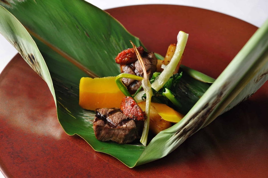 香ばしく焼き上げた牛フィレ肉を島らっきょうや島菜などの野菜と合わせました。焦げ目をつけた月桃の葉が華やかに香ります。沖縄で親しまれている「油味噌」とトマトの酸味がアクセントのソースが、お肉の旨味をより一層引き立てます。