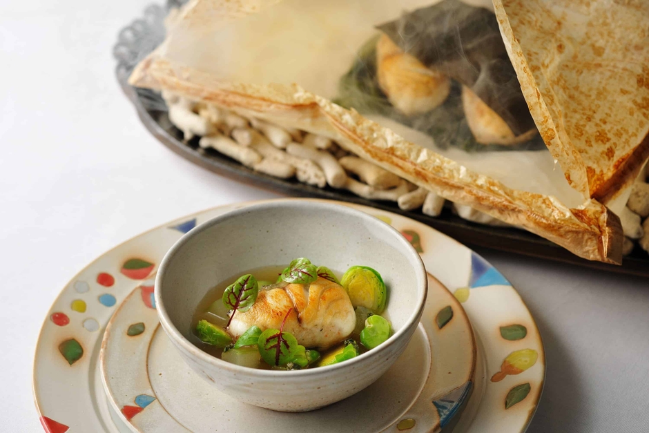 沖縄で「ミーバイ」と呼ばれるハタ科の白身魚をイタリアの伝統調理法「カルトッチョ」で仕上げました。「ミーバイ」を海老のすり身と一緒に紙に包んでふっくらと蒸しあげました。昆布だしや魚介の旨味をたっぷりと閉じ込めたスープとそら豆や芽キャベツとともに味わいます。