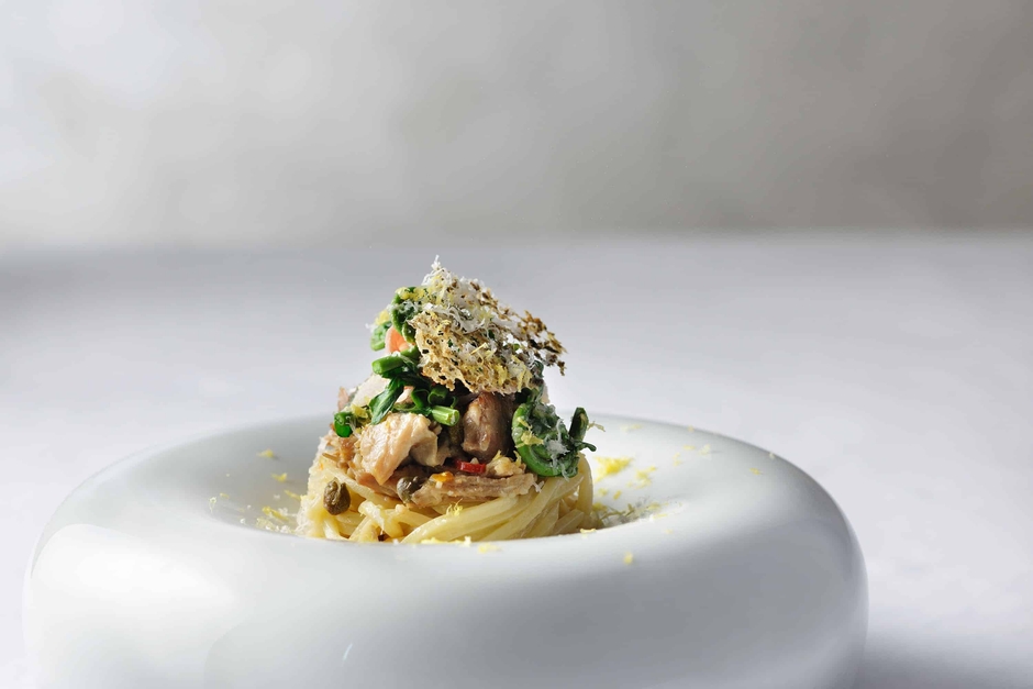 豚肩ロースをケッパーとともに柔らかく煮込んだラグーソースと沖縄で親しまれている豚の塩漬け肉「スーチカ」を組み合わせました。「宮古ゼンマイ」と呼ばれるシャキシャキとした食感を感じるゼンマイは、軽やかな味わいです。仕上げにレモンを削り、爽やかな香りが広がります。
