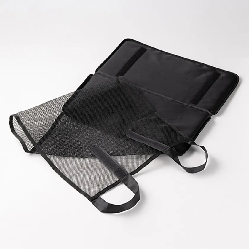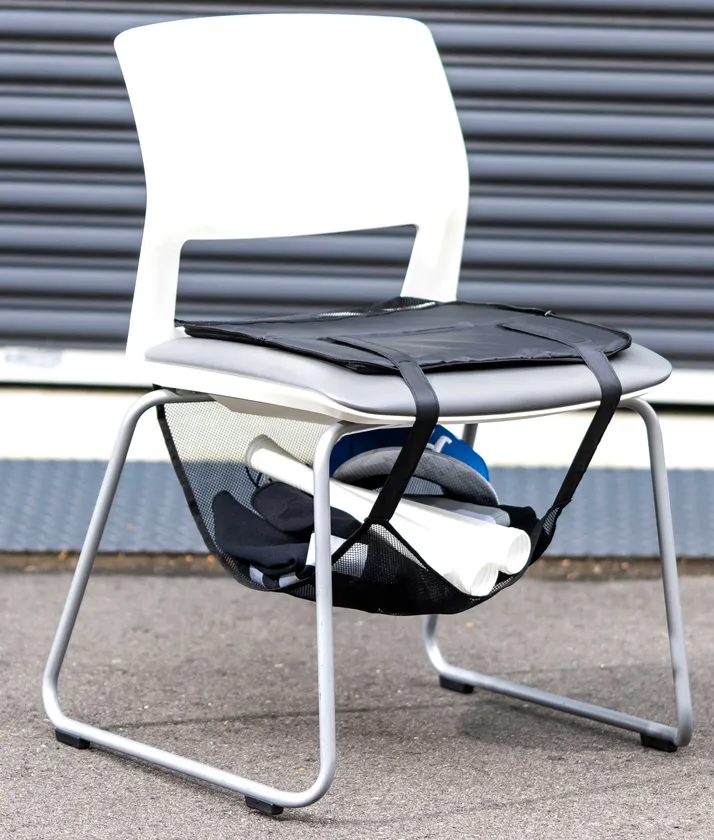 シートクッションについている収納ネットを使用することで、荷物を直接床に置かずに一時保管することができます。また、面ファスナーの長さを調節することで様々な椅子に対応が可能です。